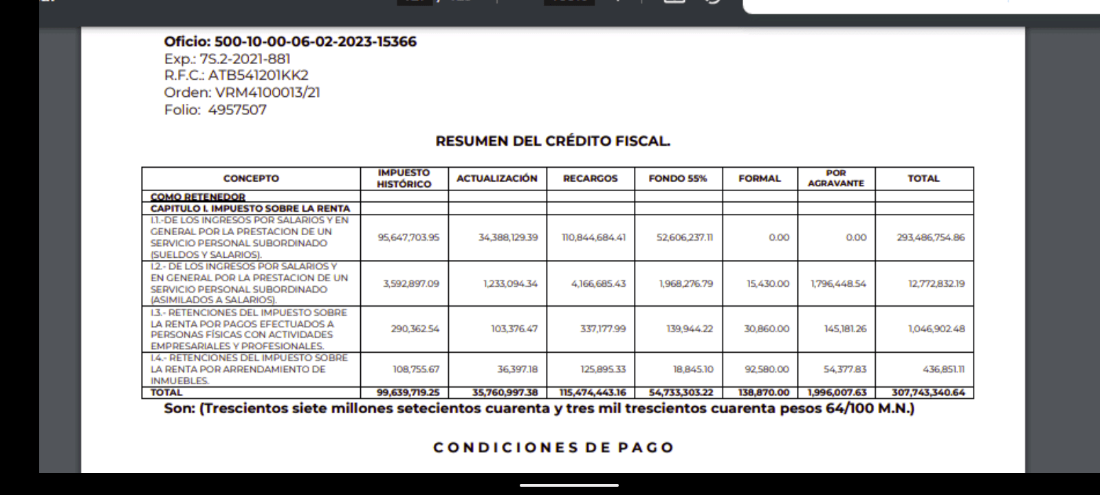El resumen del crédito fiscal determinado al Ayuntamiento de Tijuana mediante la resolución antes precisada, a la fecha del 23 de mayo de 2023, se desglosa de la siguiente manera: