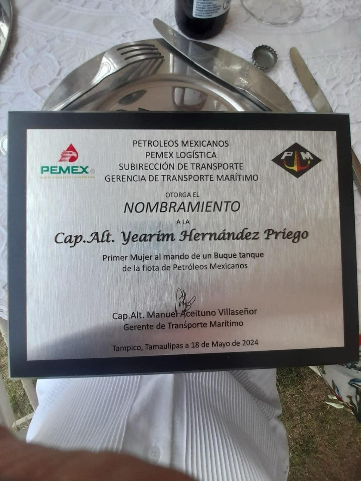 La veracruzana Yearim Hernández Priego, fue puesta al mando de un buque tanque de PEMEX, embarcación con un porte de 50 mil toneladas de peso muerto, el cual carga aproximadamente 320 mil barriles de producto.