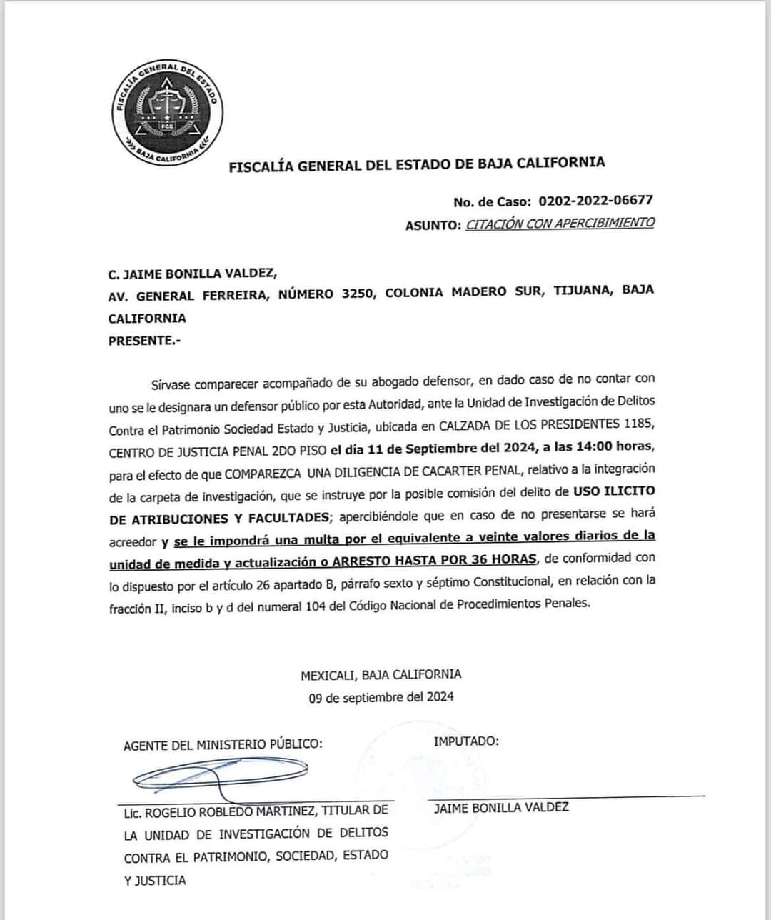 CITAN AL EX GOBERNADOR, JAIME BONILLA, PARA UNA COMPARECENCIA PENAL POR EL DELITO DE USO ILÍCITO DE ATRIBUCIONES Y FACULTADES