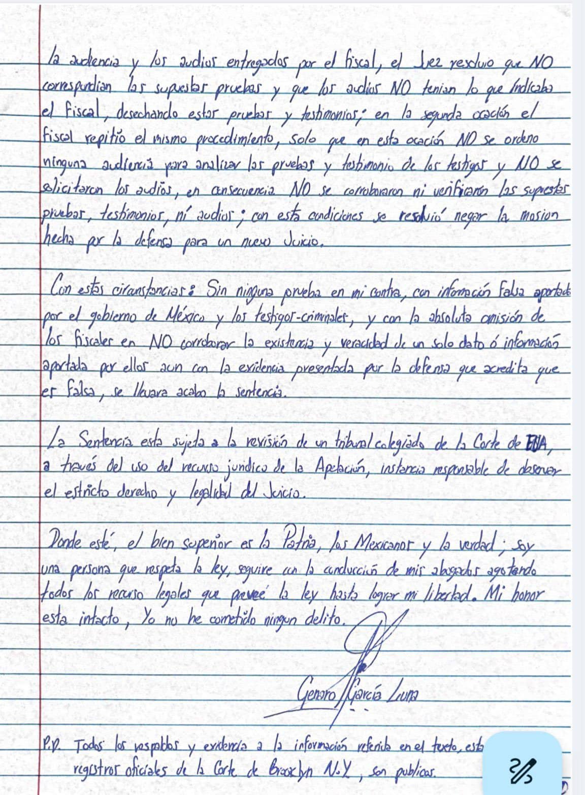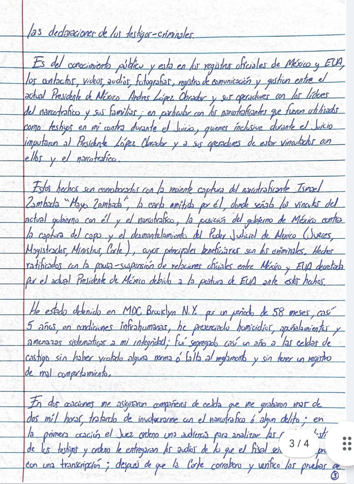 En una carta escrita desde su encierro en una prisión de Estados Unidos Acusa al presidente López Obrador y a «sus operadores» de estar vinculados con líderes del crimen organizado, acusándolo de destruir el Poder Judicial de México para beneficiar a criminales.