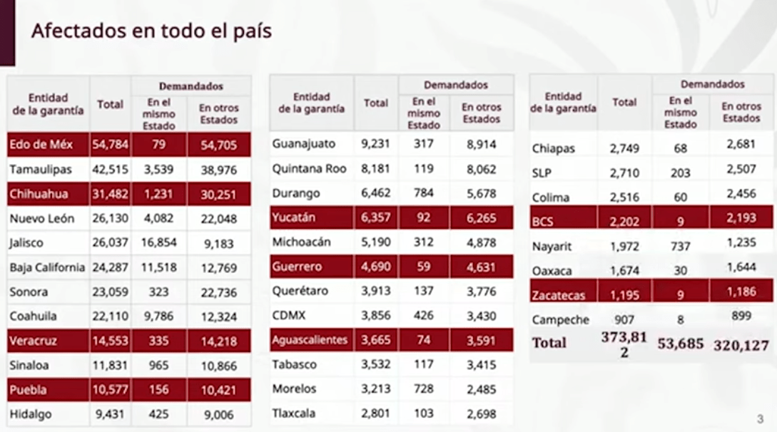 En 6 estados, se concentran el 86% de las demandas de todo el país de otros estados. Coahuila, Jalisco, Nayarit, Baja California, CDMX, Morelos, precisó el titular del organismo Octavio Romero durante la mañanera de este lunes.